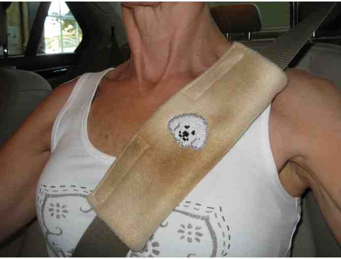 Perfect for covering any seatbelt from irritating your skin. The cross stitched Bichon head will be sure to bring a smile to anyone getting a glimpse as you pass them by.