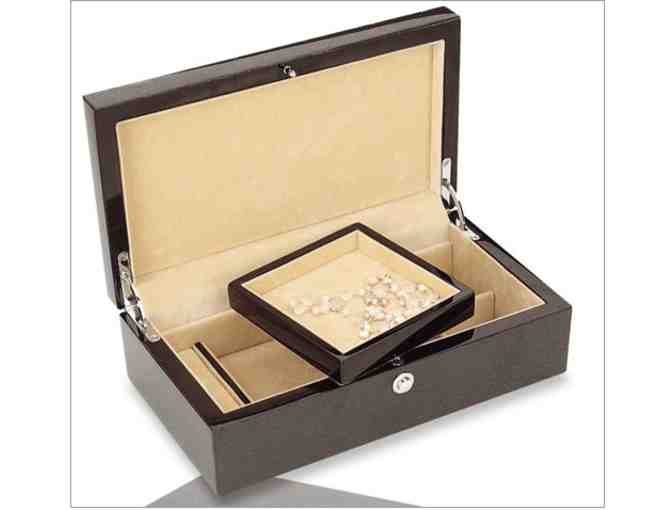 This unique black jewelry box with a piano gloss finish is 10" long, 5 5/8 inches wide and 2 7/8 in height. Thanks to Vermont Trophy and Engraving for this beautiful handcrafted chest. See photo and more info here.