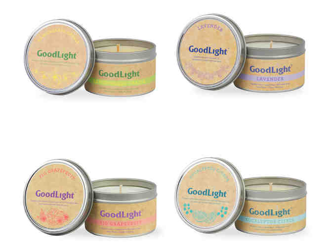 This sampler pack of GoodLight's paraffin-free scented candles includes one large 6 ounce travel tin in each of these four delicious scents: Fig Grapefruit, Eucalyptus Citrus, Lavender, and Lemongrass Cassia. GoodLight's line of scented candles is made with blends of pure botanical and essential oils extracted from plants by cold-pressing and steam or vacuum distillation. There are no phthalates, synthetic or artificial fragrances, chemicals, lead, or paraffin. The wax is 100% clean-burning palm wax and wicks are pure cotton...because you breathe what you burn.