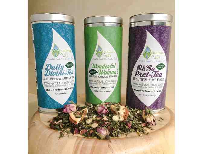 A care package of three incredible loose leaf herbal teas, for a very special lady! First, we have the Daily Divini-Tea, to give her some soul soothing refreshment; then since she's so lovely, we chose the Oh So Pret-Tea beautifully delicious romantic blend. We top it off with our incredible Wonderful Woman's nourishing hormonal balancer! This trio is sure to delight the most special women in your life!