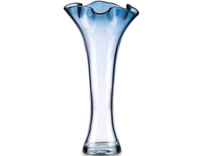 The Organics Ruffle Blue Cylinder 15" Vase makes an impact without flowers. Heavy crystal with a playful ruffled edge and rich color tops tables and shelves with artful elegance. Makes an ideal wedding or housewarming gift.