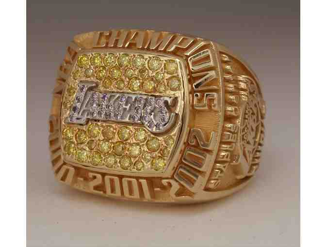 One 14 karat yellow gold Los Angeles Lakers Championship Ring provided to Staples Center Suite Holders to commemorate the Lakers' three consecutive championships (2000, 2001, 2002). The ring weighs approximately 35 dwt. of 14 karat yellow gold. The top of the ring has .95 carat of genuine yellow diamonds set in a yellow gold plate. The stones are pave set. Sitting on top of the yellow diamonds in 14 karat white gold is the Lakers logo with genuine amethysts set into the letters. Display/Jewelry box with engraved plate included. Appraisal (dated December 16, 2002) included from Henry Kay Jewelers in Glenview, IL