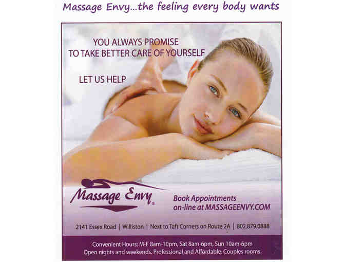 One-hour massage donated by Massage Envy, Williston, VT. Good for any Massage Envy location in the US. To book an appointment in the Williston location, call 802.879.0888. Let them help choose just the right massage therapist and treatment for you.