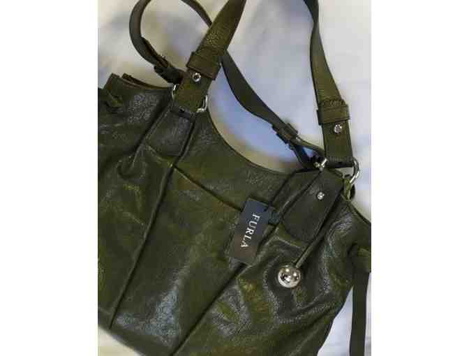 Enjoy this beautiful metallic dark green Furla designer bag!