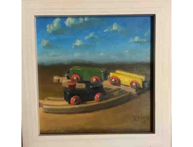 Original oil painting of toy trains by Kathy Thile. Perfect for a child's room. Painting is 6 inches by 6 inches. In a white wooden frame.