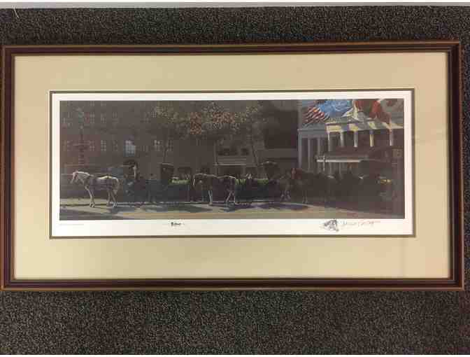 Framed Print of “The Plaza” Signed by Jenness Cortez August 1982. Features a row of three handsome cabs (horse’s n carriage) outside NYC Plaza Hotel in the gathering dusk rarely seen print. Measures 35.5 x 19"