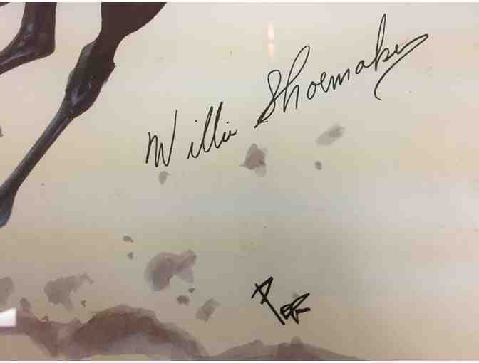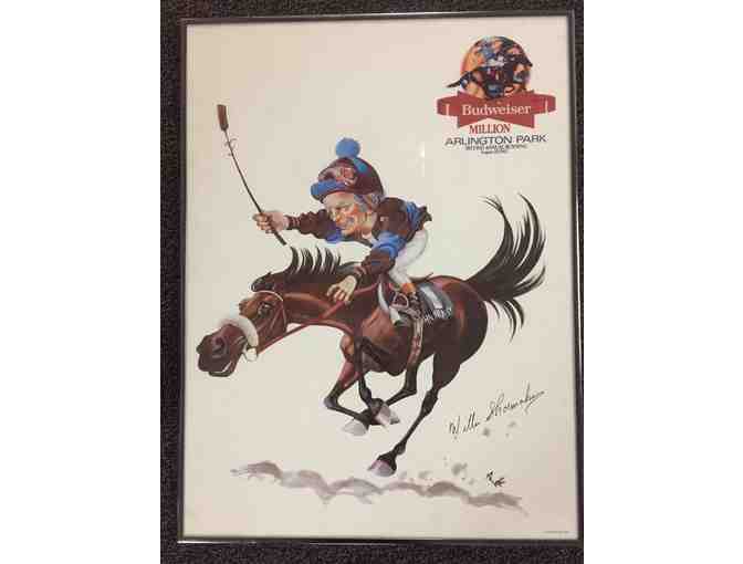 A Signed Cartoon Rendition of John Henry in the 2nd Running of the Budweiser Million at Arlington Park on August 29th, 1982. Signed by Legendary Jockey Willie Shoemaker and by cartoonist Pierre Bellocq, better known as PEB and includes 1982 ©. Measures 18.5 x 24.5"