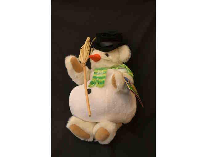 15" Classic Bear with vanilla fur and brown eyes: dressed in a snowman outfit complete with top hat, carrot nose, green snowflake scarf and a straw broom.