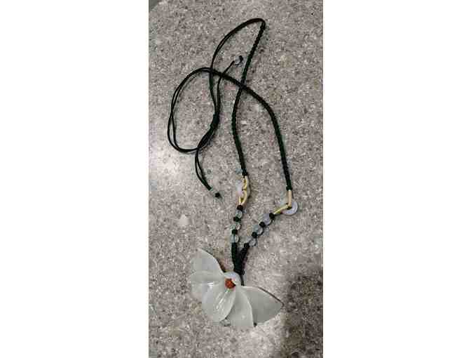 Beautiful jade flower pendant on a braided necklace with jade accent beads, adjustable length between 14”-24”.