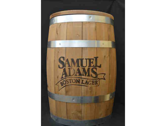 A wooden barrel barring the "Samuel Adams Boston Lager" logo. Great for any cave or fans of Samuel Adams brews!