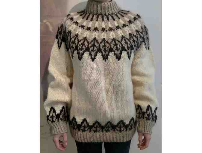 Handmade wool sweater with black and white leaf design.