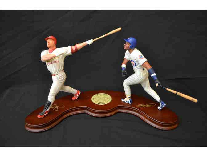 Danbury mint Mark McGuire & Sammy Sosa "1998 Home Run Kings" ceramic figurines with wooden bats standing on a wooden base.
