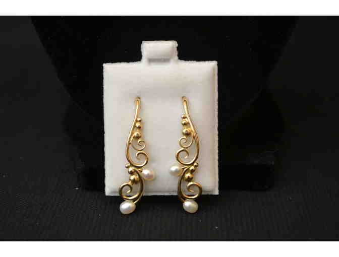 A pair of beuatiful 14K gold fabricated earrings with accented with fresh water pearls from David Virtue Co. Exclusively using 100% non-mined, reclaimed & recycled Gold & Platinum and conflict-free diamonds.