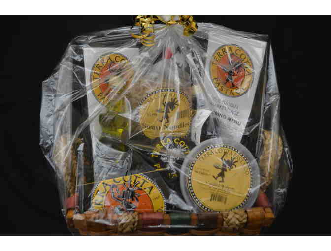 A Terra Cotta Pasta Company gift basket with a TCPC reusable carry bag, olive oil & balsamic vinegar bottles, TCPC soup noodles, TCPC candied walnuts, a TCPC hat and a $25 TCPC gift card (good at any location).
