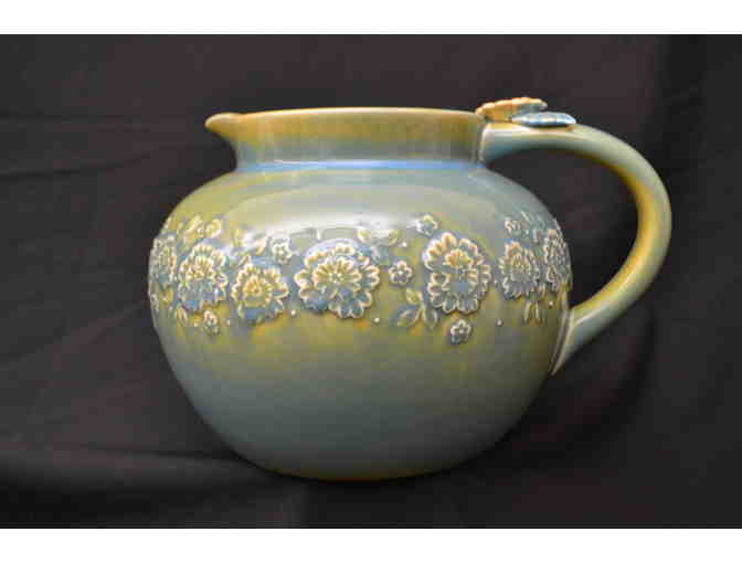 A teal and gold antique washed pitcher with floral relief. Dishwasher and microwave safe!