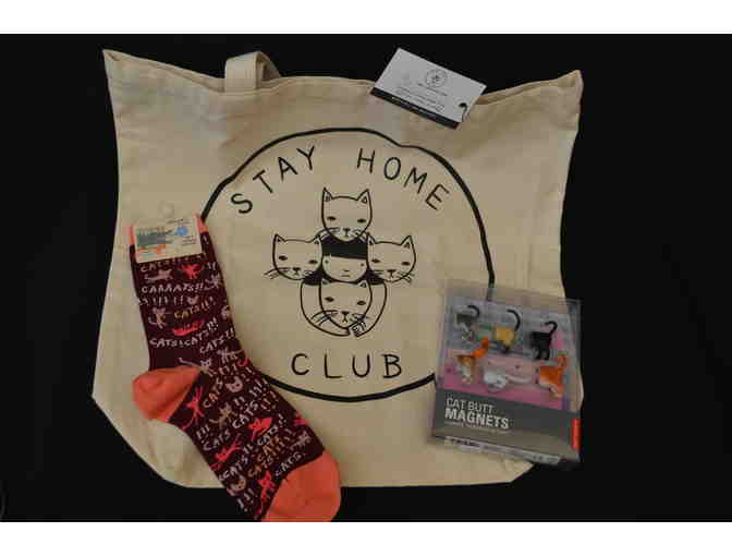 A small gift bag containing a pair of "Cats, Cats, Cats" socks, a "Stay Home Club" tote and a collection of cat butt magnets.