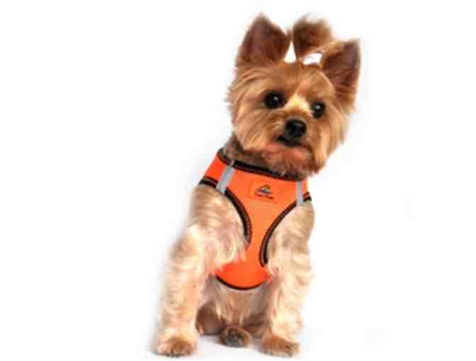 Doggie Design American River Dog Harness Top Stitch - Iridescent Orange The American River Dog Harness created by the harness experts at Doggie Design, is an easy to use mesh step in harness with a patented choke free design. This soft dog harness features conforming shape fit seam technology that causes the harness to conform to the curve of the dog's chest for a comfortable fit where the pulling is only on the dog's chest, making it choke free and trachea safe. The harness secures at the back with a double safety closure with Velcro and high strength plastic side release buckle with a patented closure slide that allows up to 3 inches of size adjustment. A double "D" ring for leash attachment adds strength. The American River harness is made from high quality polyester with a zig zag trim binding stitch, which prevents missed stitches and creates a super strong bond. The special top stitch pattern on this harness matches the color of the soft mesh body. Reflective strips make nightly walks much safer when using this harness. It is also great for use in the car as a seat belt harness. Machine wash, line dry. Certified Break Strength Tested to 386 Lbs, by an International Independent Testing Laboratory.