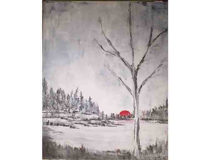 The painting is a hand painted original by local artist Chelsea Bivens. It is a 20”x16” oil on canvas landscape painting done in black and white with red.