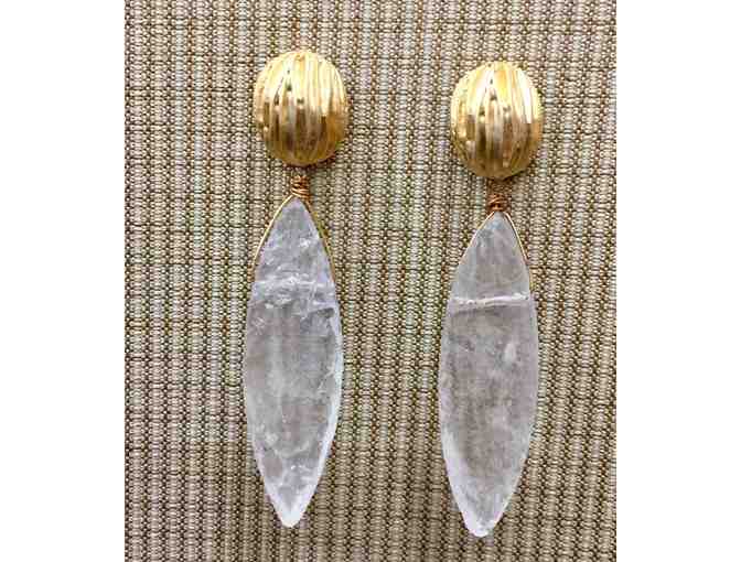 Hand made by jewlery artist Bianca Terranova, these one of a kind drop earrings feature plated 14K goldplated posts with lozenge rough face rock crystals.