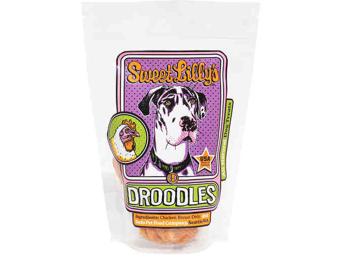 The winning bidder will enjoy a basket containing four bags of Sweet Lilly's Droodles in four flavors - 1. Chicken, 2. Chicken and apple, 3. Chicken, apple and pear, and 4. Chicken and banana. Their treats are all natural, made with hand-trimmed chicken breasts and fresh fruits and veggies! Made local.