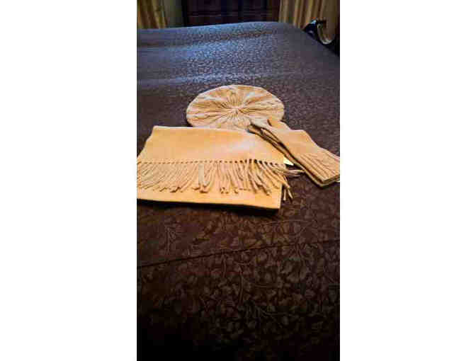 Lovely camel color 100% Cashmere scarf, cable knit and Tech gloves