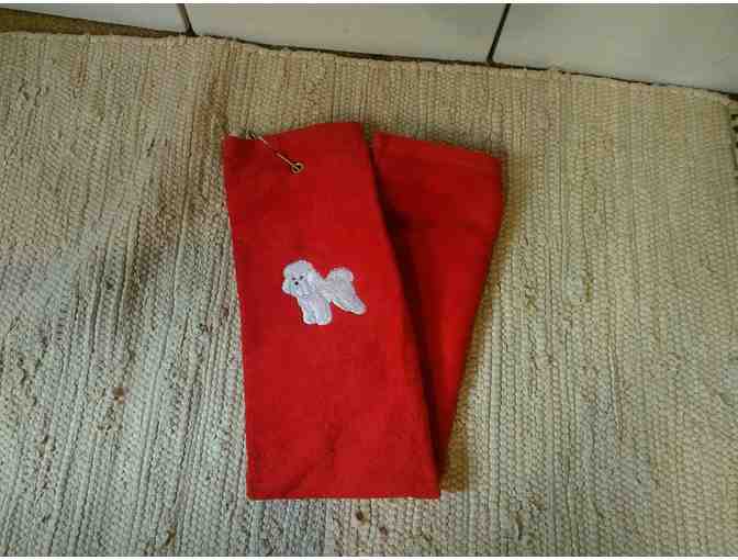 Velour tri-fold red golf towel embroidered with a Bichon. Includes brass hook for attaching to golf bag or use this in your powder room and attach to towel or hook rod.
