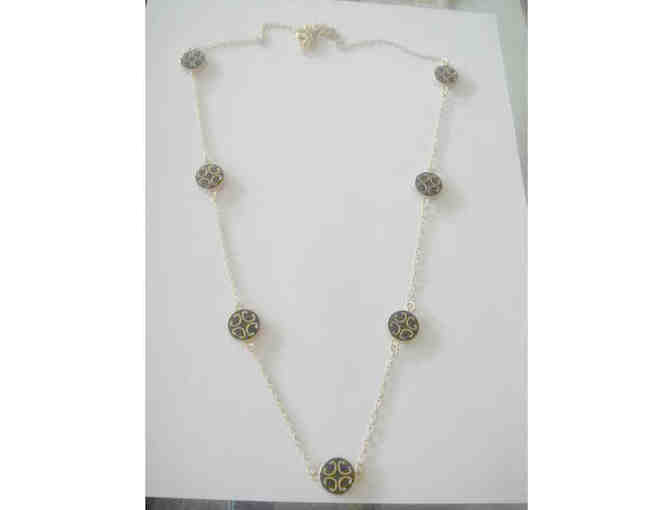 32 inch gold tone necklace with 7 black and gold enamel inserts.