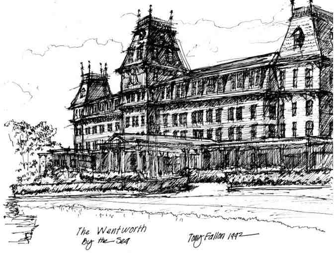 A 5 notecard set of a pen and ink drawing of The Wenworth By The Sea Hotel: drawn by Tony Fallon circa 1992. This was drawn while Tony was assisting in the effort to save The Wentworth from demolition.