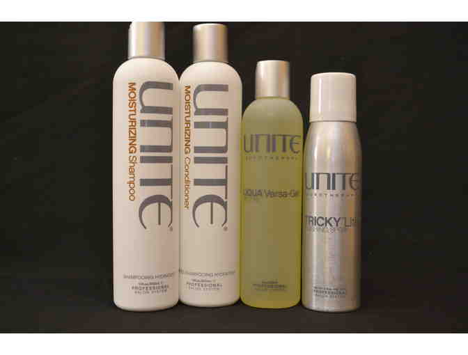 A gift bag full of Unite hair products. The shampoo and conditioner are both Vegan, sulfate free, paraben free and much more. Also included is the Liqua Versa-Gel and the Tricky Lite finishing spray.