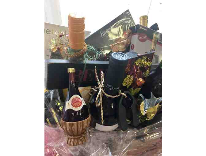 This festive gift basket is filled with a wide range of wine and treats for any celebration or get-together! It includes a selection of wine (both red and white)nuts, chocolates, wine bottler cooler, crackers, decorative wine items and more!!