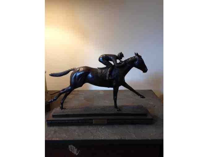 The Man o' War is a bronze by Marilyn Newmark (Now deceased). Man o'War is considered oen of the greatest Thoroughbred racehorses in history, losing only once in 21 career starts. The artist was from Long Island and did many equine sculptures and sold very well. This one is on a 14" x 3" base and 10" high.