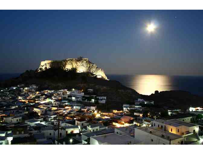 Lindos Moon (2005), from Castonguay's personal travel photography series, depicts the Greek castle of Lindos perched high above the modern day seaside town with the full moon reflecting on the water in the distance.