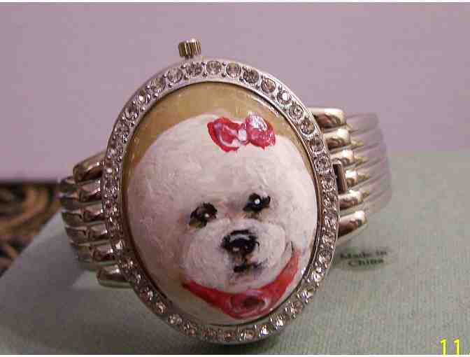 You are invited to bid on hand painted Bichon on a rhinestone genuine gemstone flip up cuff watch ,spring opening,1 1/2" tall 1 sz fits most .I painted the item with acrylic paint,sealed to last . Manuela Quick,Poookie