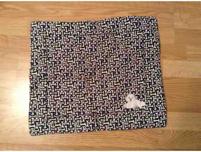 Very very gently used crate pad that came with our SPR adoptee a few years ago. We kept it for sentimental reasons, but he sleeps on the bed! Bichon is emboidered on the lower right corner. Blue cordorouy backing. Allover print with dog bones and balls. White/black and navy.