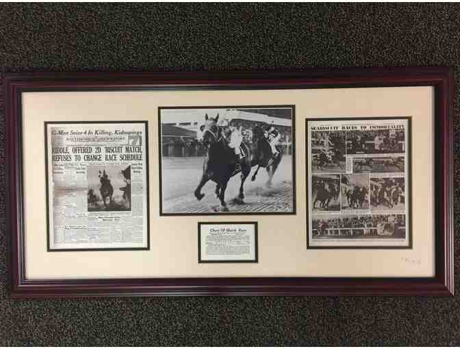 Limited Edition 476/1938 Framed Match Race Commemorative of Seabiscuit. Features clippings from the November 2nd, 1938 Baltimore News-Post of Seabiscuit’s race with 1937 Triple Crown winner War Admiral in the 1938 Pimlico Special. Seabiscuit, a grandson of the immortal Man o' War and the preeminent horse based in the western US, almost faced each other several times that summer but for one reason or another, they never met. Finally, a meeting was arranged for November 1, 1938, in the Pimlico Special, in what was billed as The Match Race of the Century. Seabiscuit, a year older than War Admiral, won by four lengths and broke the track record. A photo of this historic race, a chart of the match, and an Affidavit of Limited Edition from the Gallery of Champions. Framed, measures 32.5 x 16.5"