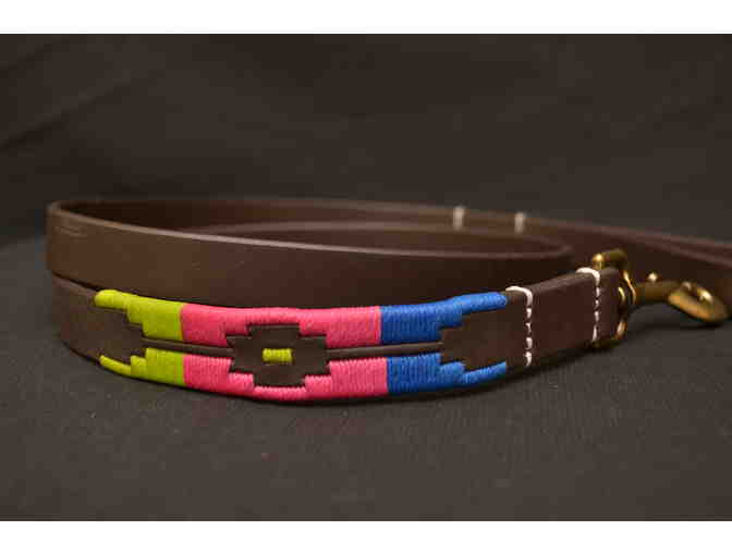 A royal blue, pink, and lime green Moreno Polo dog leash in size medium from Shires Equestrian. Handmade in Argentina with high quality leather.