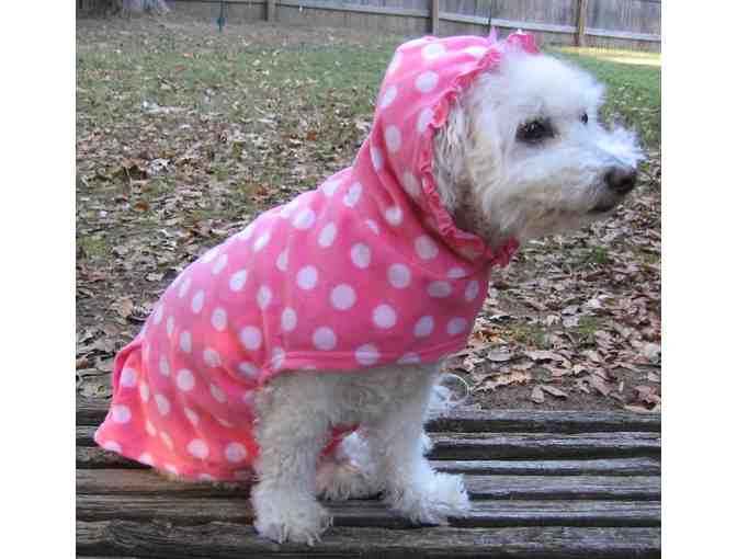 This adorable pink polka dot hoodie Jacket will be so cozy on your little girl dog. Has Smoochie inside a heart on a pocket on the front. The jacket goes over the head and wraps under the stomach with a velcro closing.