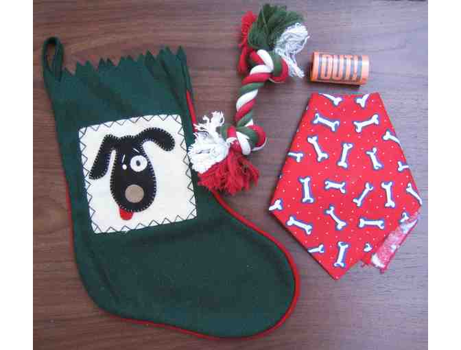Dogs love having their own christmas stocking hung on the mantle filled with a Christmas toy, red kerchief with bones and a roll of poop bags.