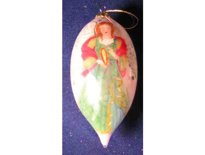 The Li Bien which means "inside" is a tear drop glass ornament showing an angel with wings holding a tamborine. The ornament showcases the age-old skill of inside painting. Through a small opening, the artist inserts a miniature brush to paint the artwork.