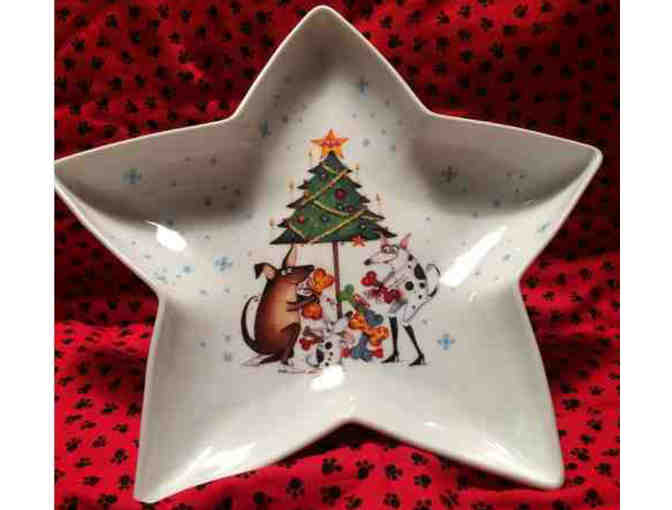 Here's a beautiful, but done whimsically, star shaped dish/bowl. The inside of the bowl shows a traditional "doggy Christmas gathering". The tree is lit, the gifts are being exchanged...you can't help but smile. What a terrific Christmas decoration for your table. Although I would say you could use it year round!