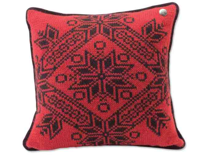 Inspired by traditional Nordic motifs for a touch of Chalet style. Pure wool face, cotton velveteen backing. Accented with Edelweiss-etched pewter button. In black/red. 18" x 18". Feather/down insert. Dry clean. Imported.
