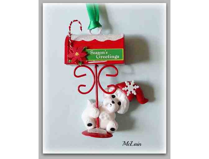 Darling Bichon in his red stocking cap, sits by the mailbox waiting for some holiday goodies to arrive!