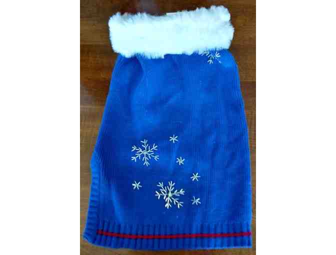 L Royal Blue Holiday Sweater w/ White Faux Fur Collar & Gold snow flakes on the front
