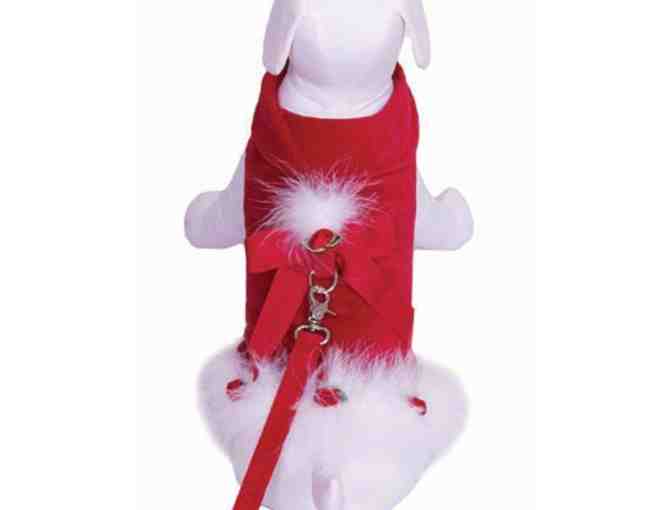 Red velvet harness dress with white fur trim. Matching leash with white fur trim. Will fit up to 20 inch chest. Length from neck to tail is 14 inches. Size L