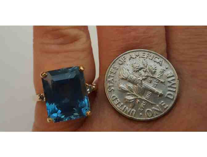 Large emerald shaped blue topaz set in 14k gold with small diamond accents. Small size.