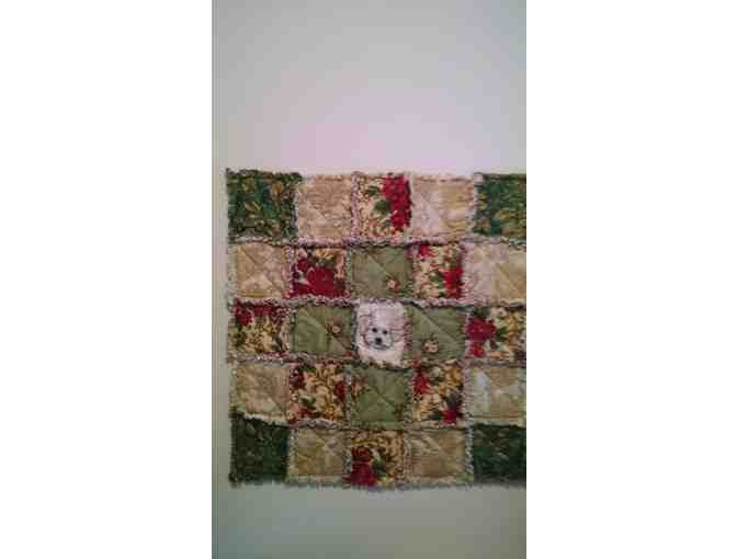 A lovely Christmas quilt, with the smiling face of everyone's favorite breed in the center! The quilt measures approximately 30" x 30", and features Christmas colors and fabric.