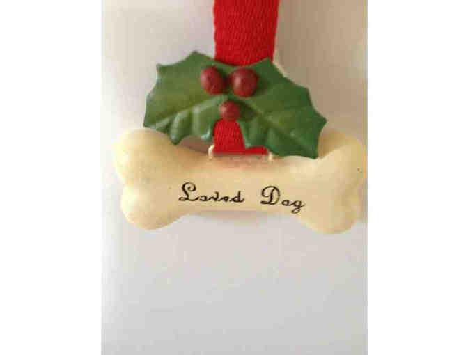 This Christmas ornament says "Loved Dog" Size: 2.5" wide X 5" long, including the ribbon