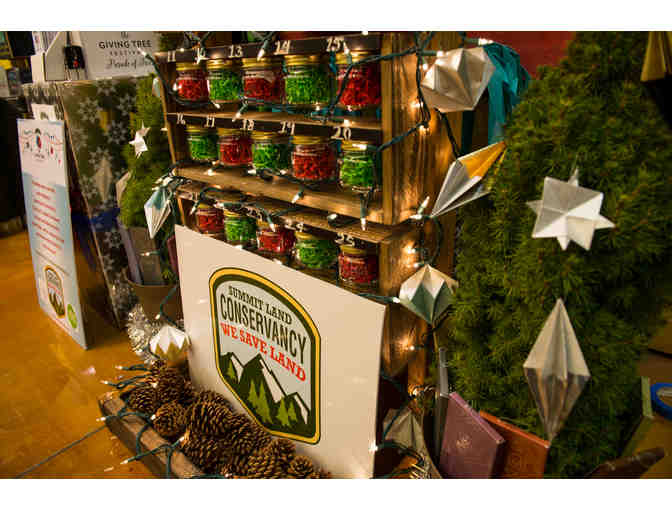 A Swiss style “advent calendar” with vouchers behind each advent door. The vouchers will be donated from different local Park City companies--25 in total. The tree will also be dressed with items from different companies in Park City that are stocked at Whole Foods.