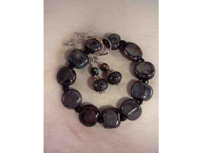 Blue Raku Stretch Bracelet & Matching Earrings Artisan Jewelry Set