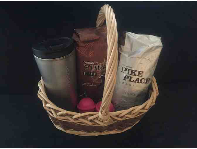 A basket perfect for your coffee lover filled with 1 lb. of Yukon, 1 lb. of Pike Place Roast, 2 Starbucks Ornaments, & a Stainless Steel Starbucks Tumbler.